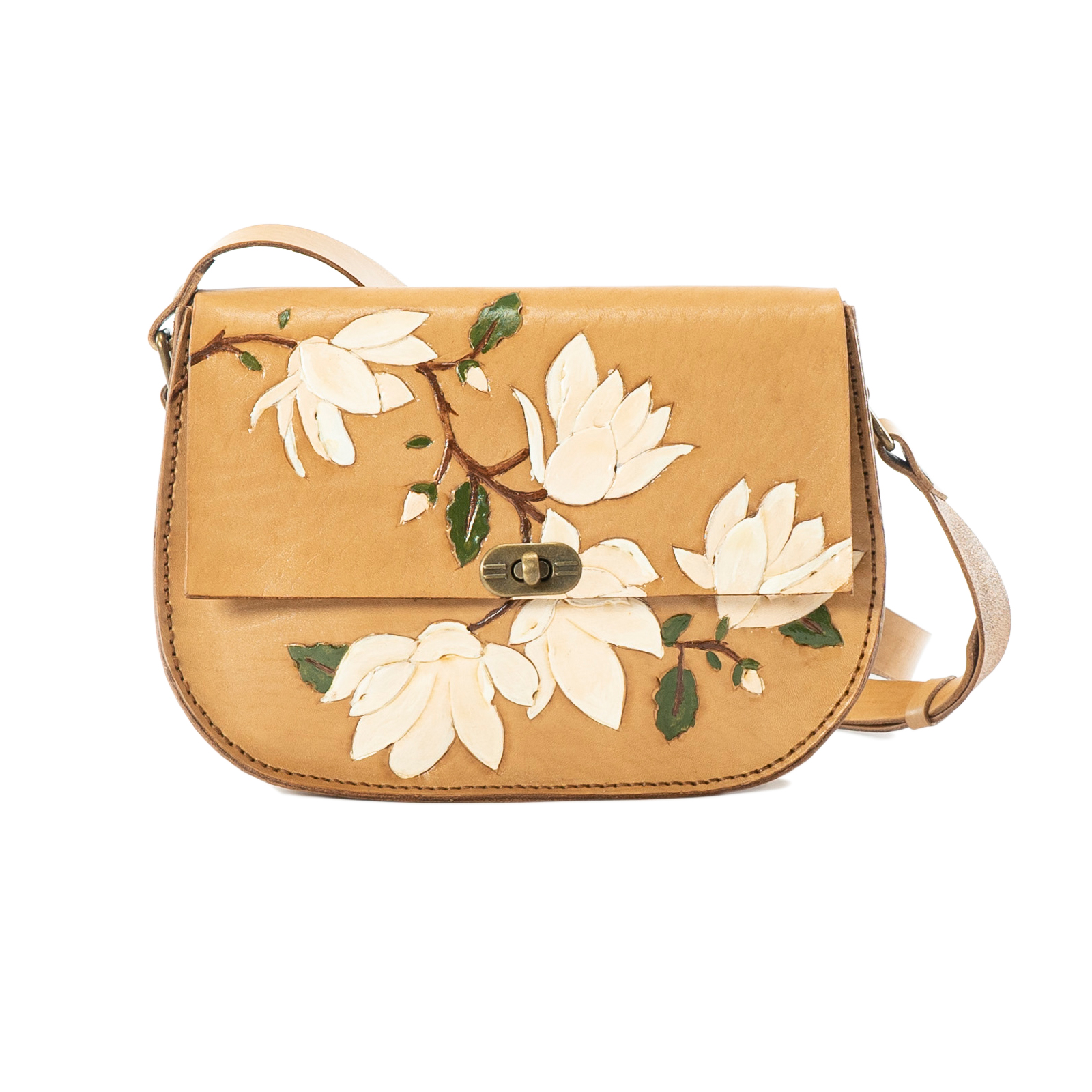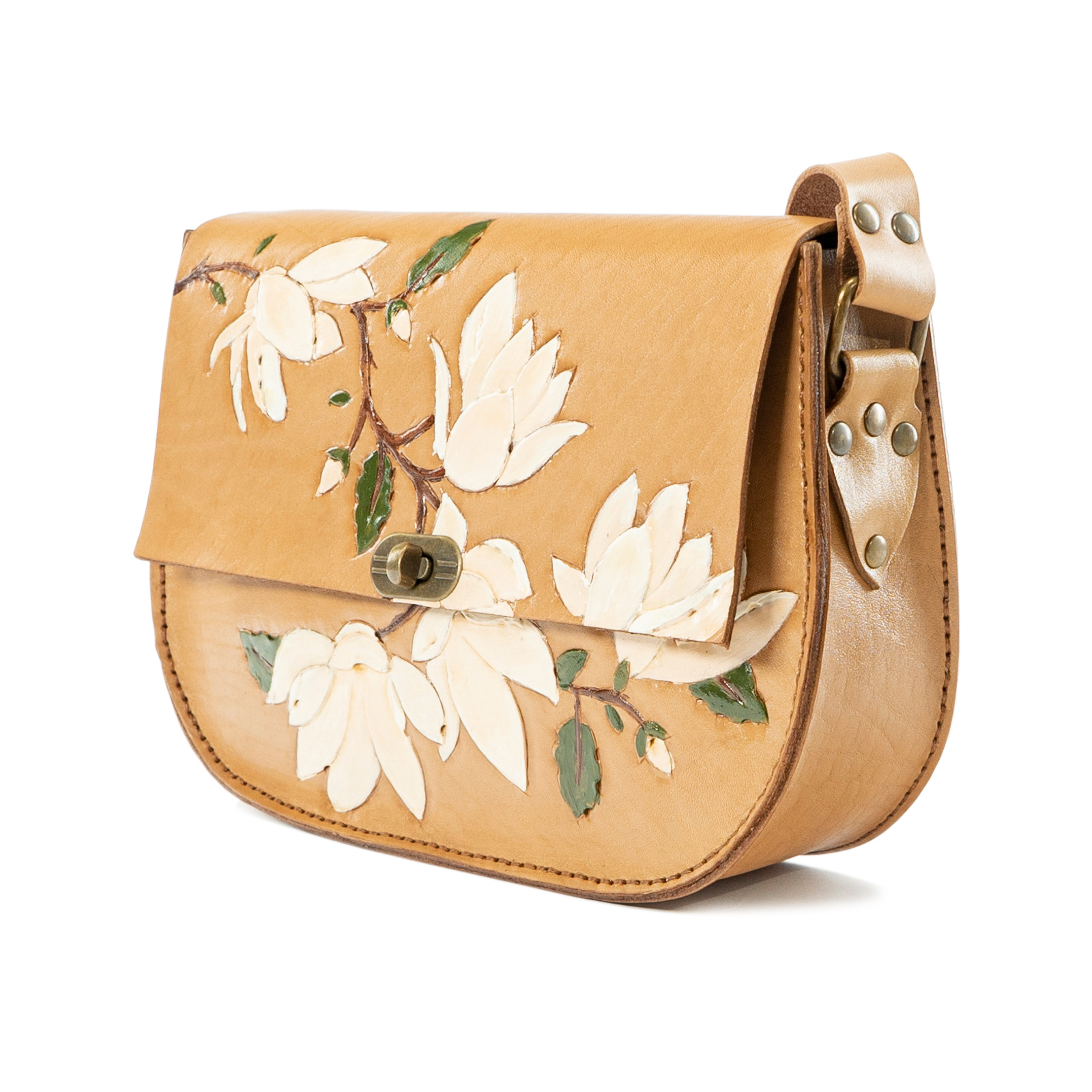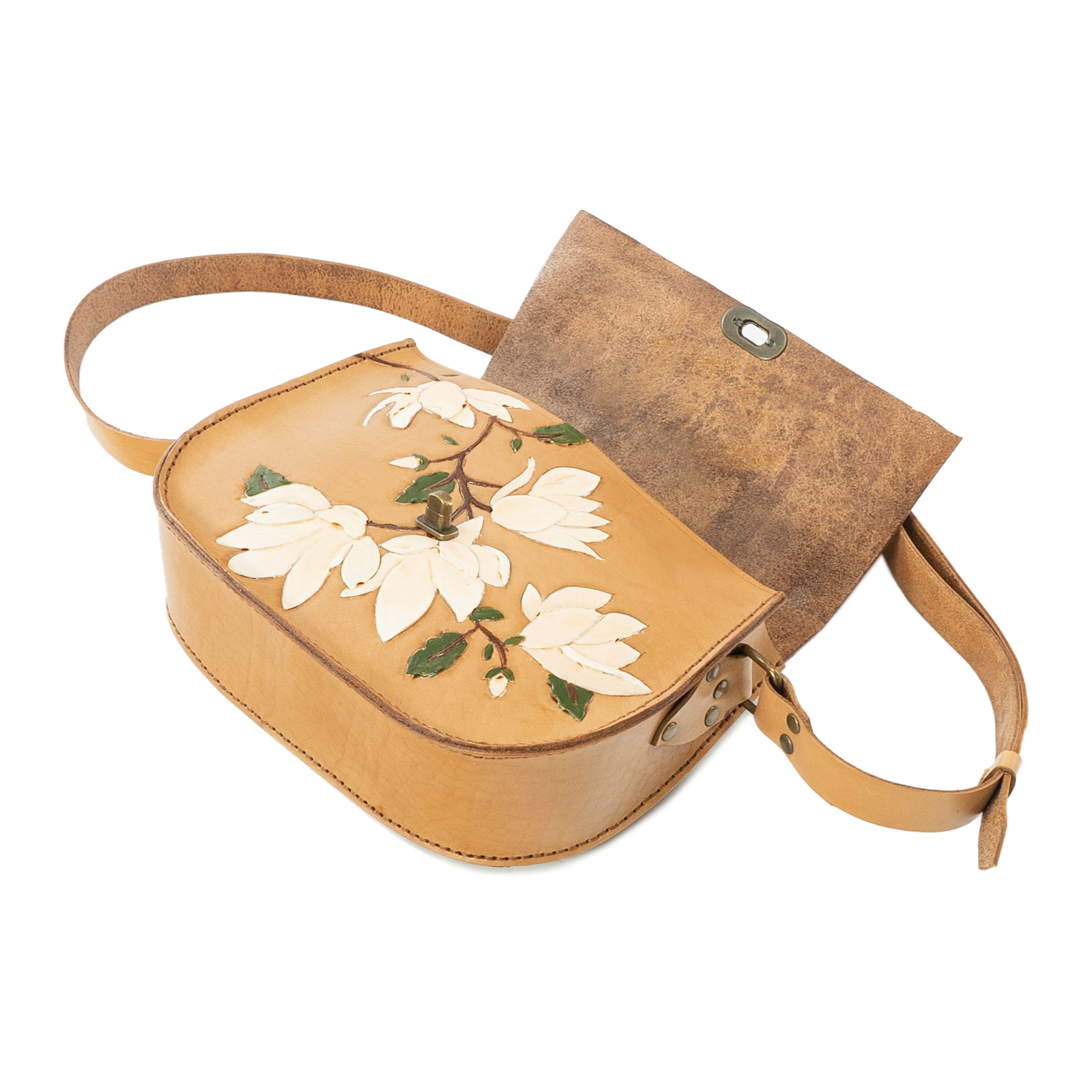Özellikler: Bitkisel Tabaklanmış Dana Vaketa (2.2 mm) / Elde Kraftla Dövülmüş/ Elde Akrilik Boya ile Boyanmış / Manolya Desenli / Deri Cilalı / Antik Kilit